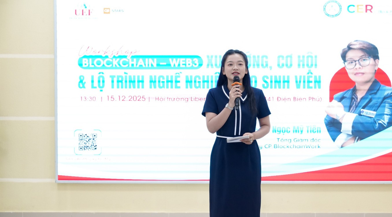 Buổi workshop được dẫn dắt bởi bà Lê Ngọc Mỹ Tiên – Tổng giám đốc và đồng sáng lập BlockchainWork. Bà có nhiều năm kinh nghiệm trong phát triển cộng đồng, xây dựng đội nhóm, quản lý dự án và hoạt động trong lĩnh vực blockchain. Tham dự chương trình còn có ThS. Trần Thanh Huy – Phó Giám đốc Trung tâm Hợp tác doanh nghiệp UEF.